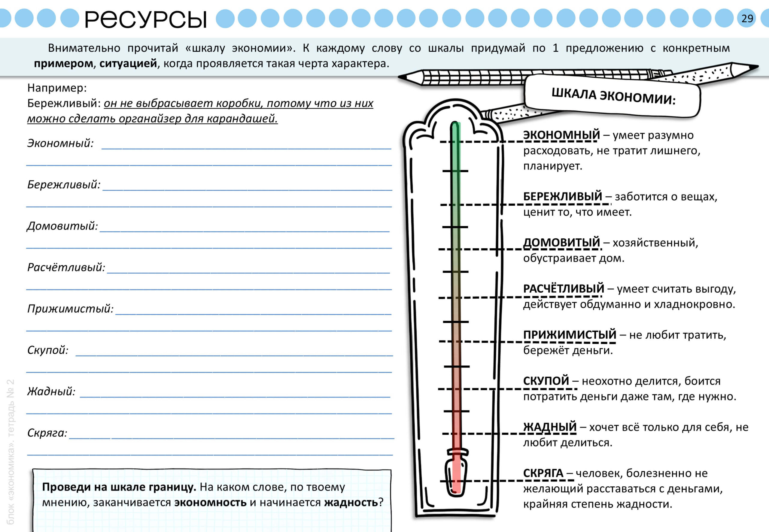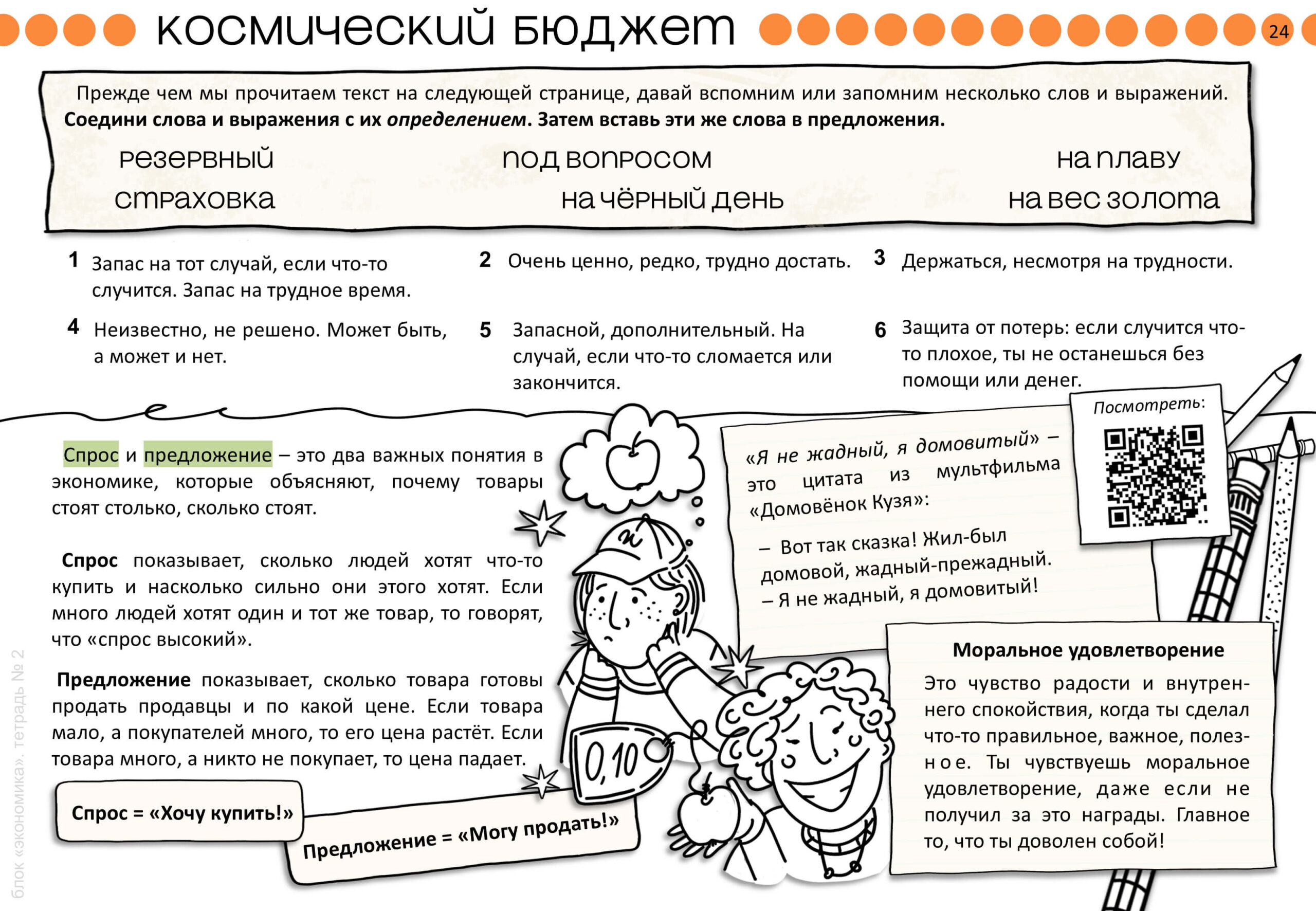 Далее изучаем спрос и предложение и работаем со «шкалой экономии» — от экономного до скряги. Кроме того, учимся формулировать тезисы и аргументы на примере темы «Кому принадлежит Луна?».