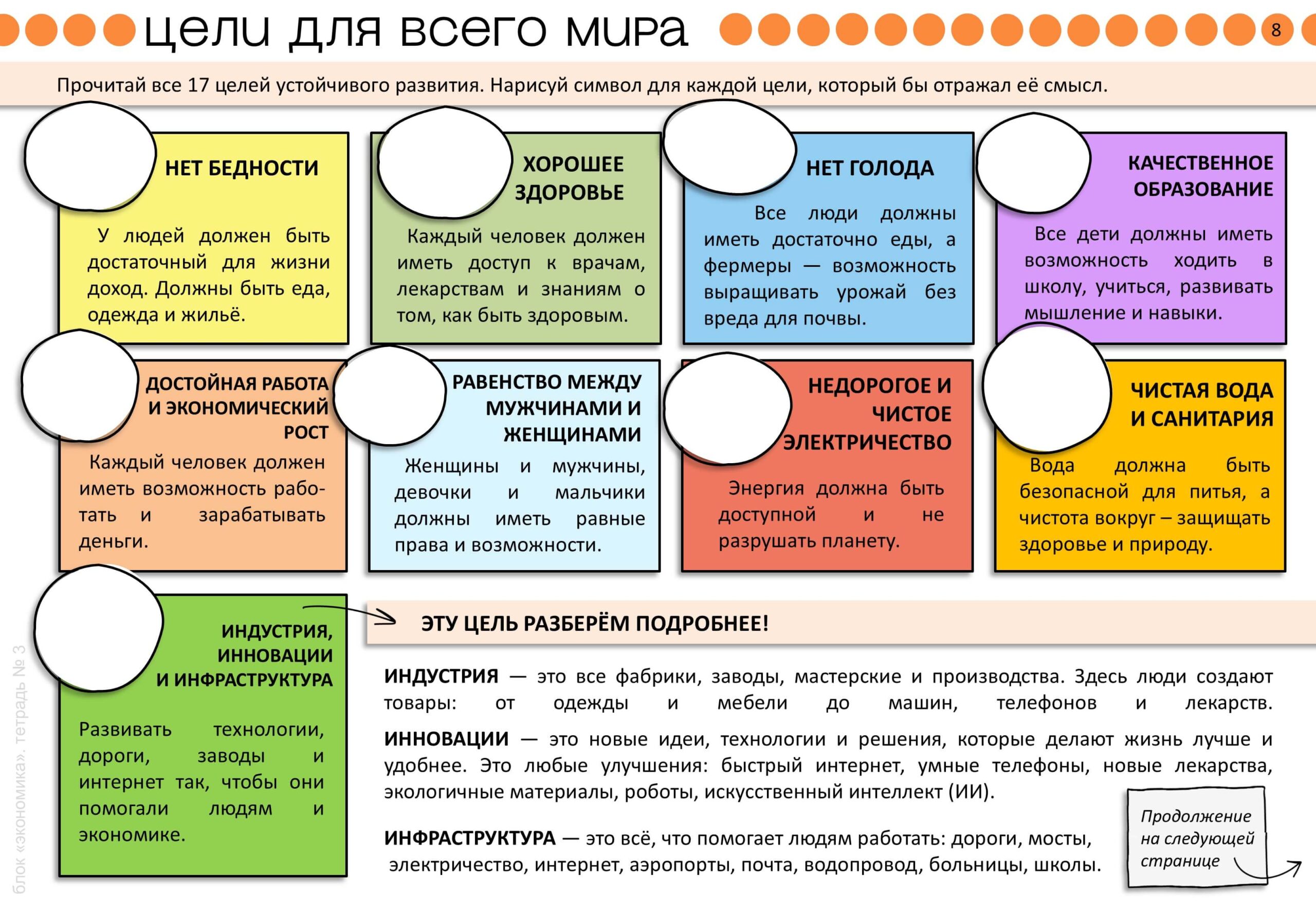 В третьей тетради мы знакомимся с Целями устойчивого развития (ЦУР). Затем используем приём «рыбий скелет» для цели «Образование».